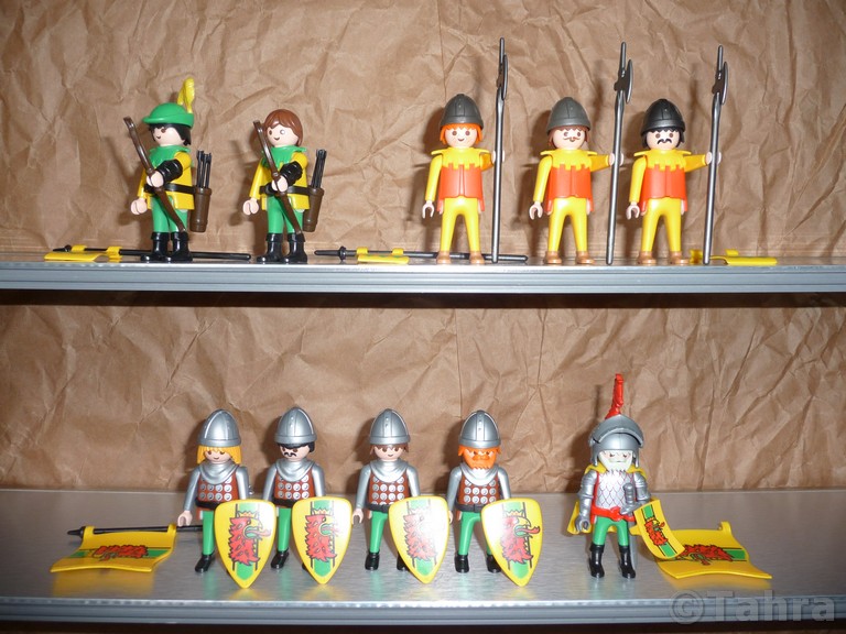 That first guy is Meleager.. The others were assigned as needed.. Including giving my sister's amazing bat knight the black knights! That design for the green squire is a PERFECT match for the shield - how amazing is that? I think that torso is from the merry men or the hideaway tree of the same time!