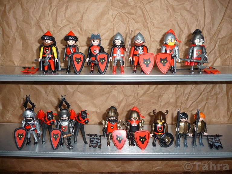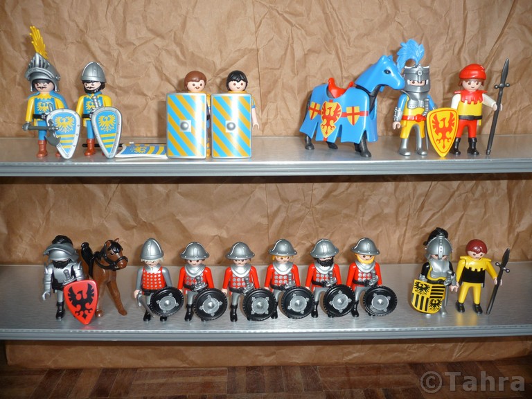 We created the knight for that "multiboy" set with the blue caparison.. And also the one in the bottom - the original klicky (Meleager the Mighty <music>) changed heraldry (and only remained in armor because he was so named!), and seemed a waste to use one of them (we have several) here - he has such a beautiful chest!
